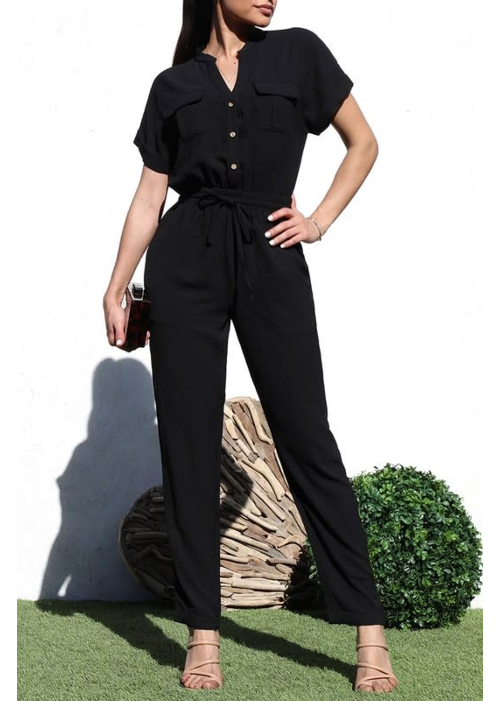 DDDD6120B - BUTTON DOWN WOVEN JUMPSUIT W ELASTIC WAIST BAND